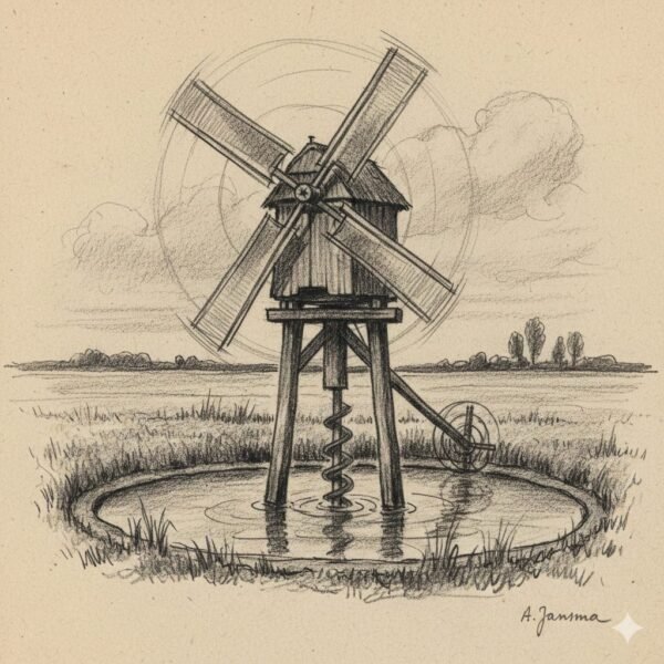 De geschiedenis van de watergangen in de Madesteinsepolder (onderdeel van het recreatiegebied Madestein in Den Haag) is daarom een boeiend samenspel tussen eeuwenoud polderbeheer en moderne landschapsarchitectuur. De monnikstjaskers die je daar ziet, zijn niet alleen decoratief; ze vertellen het verhaal van hoe Nederlanders al sinds de middeleeuwen vechten tegen (en mét) het water. De oorsprong: De Madesteinsepolder, maar dan als buitendijks kweldergebied. Buitendijks: de geprojecteerde zeewerende dijk van Schieland lag veel meer oostelijk van Den Haag. Men vond dat dat dorp niet beschermd hoefde te worden door dat zeeweringsstelsel omdat het op compactere duinen lag dan de rest van Holland. Terwijl Madestein best ook wel zo nu en dan mocht onderlopen, want daar woonden maar armelijke stakkers die geen droge voeten geborgd hoefden te krijgen vanwege de graaf van Holland. Ze betaalden nauwelijks belasting en te fiscaliseren was er niets. Voordat Madestein een recreatiegebied werd, was het een agrarisch polderlandschap. De polder maakte deel uit van het Hoogheemraadschap van Delfland. Veenontginning: Oorspronkelijk bestond dit gebied uit veen. Om het land geschikt te maken voor landbouw en veeteelt, moesten er sloten en vaarten (watergangen) worden gegraven om het water af te voeren naar grotere boezems.Inklinking: Door die ontwatering klinkt het veen in, waardoor de bodem daalt. Hierdoor werd de inzet van molens noodzakelijk om het water letterlijk “omhoog” te malen naar de vliet. De rol van de Monnikstjasker is fundamenteel voor het polderstelsel dat zich na 1420 gaat ontvouwen. De tjasker is een van de kleinste types windmolen in Nederland. In de Madesteinsepolder hebben ze een specifieke historische en educatieve functie: Eenvoudig maar doeltreffend: In tegenstelling tot grote poldermolens, is een tjasker mobieler en simpeler. Hij bestaat uit een as met wieken die direct een vijzel (de schroef van Archimedes) aandrijft. De “Monniks”-benaming: De term verwijst vaak naar de sobere, eenvoudige bouwstijl die doet denken aan de houten poldermolens die vroeger door kloosterordes werden gebruikt voor kleinschalige bemaling.