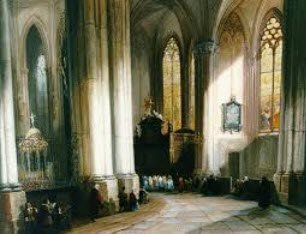 Richting de Mer-wede. Dat is een enorme onafzienbare zee-arm.  Met uitmondingen naar zee tussen de door zeehonden bevolkte zandplaten gelegen bij de Hoek van Holland en Walcheren. De bisschop van Utrecht zet de Benedictijnen van de Sint Paulus-abdij in de nederzetting Utrecht tot gelijke polder-arbeid. Ze werken schoppenrinkelend in het glinsterende brakke land westwaarts, hun Egmonder broeders tegemoet. Ze leggen de legendarische Oude Dijk door Zuid-Holland. En hun Egmonder collegae de Schielandse Zeedijk. Beide dijklichamen zijn nog zichtbaar als glooiende verhogingen in het Hollandse groene land. Daar waar de broeders elkaar aannaderen komt een groot pakhuis vol poldergereedschap, rietmatten, palen, planken en zware bazaltstenen, hennepvlechtwerk, teergerei en platbodems voor transport. En, o ja, een afgeschoten ruimte om de eucharistie te vieren. Ter herinnering van Hem in wier naam Benedictus besloot tot de organisatie van zijn Orde. Een koor met altaarsteen. Daar, op de plaats van dat pakhuis, wies later De Laurens. Rotterdams’ Stadskerk.